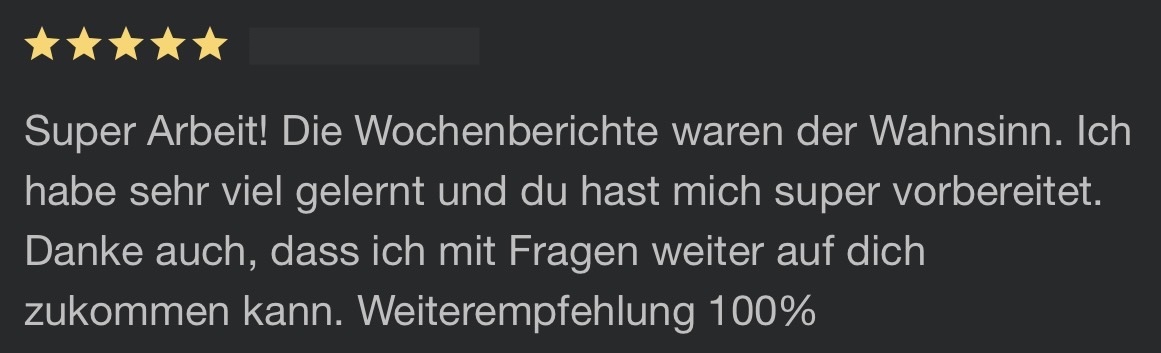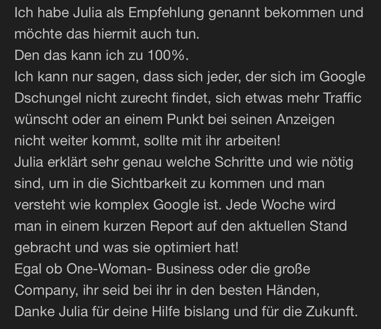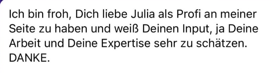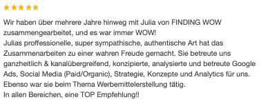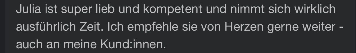 »Die Entscheidung mit Julia zusammenzuarbeiten war eine der Besten, die ich in meiner Selbstständigkeit getroffen habe. Bei ihr fühle ich mich sowohl aufgrund ihrer offenen und herzlichen Art als auch wegen Ihrem unfassbar großem Wissensschatz & ihrem Können sehr gut aufgehoben. Sie nimmt sich Zeit, sie erklärt und ist wahnsinnig geduldig.«