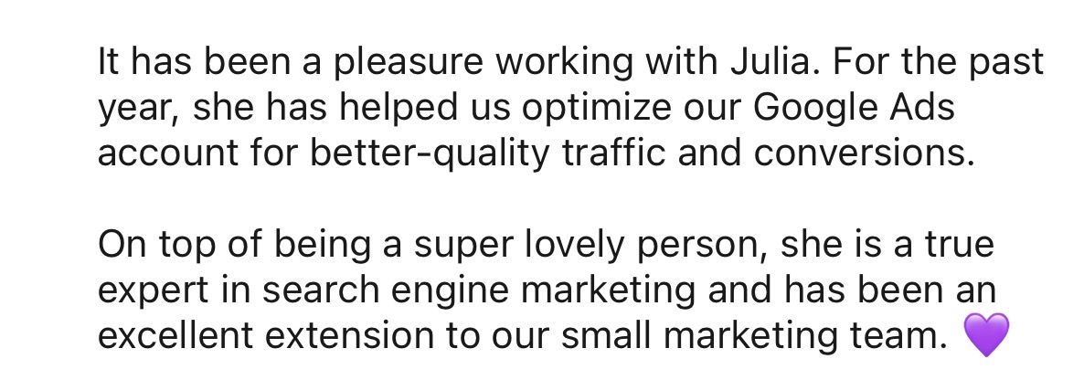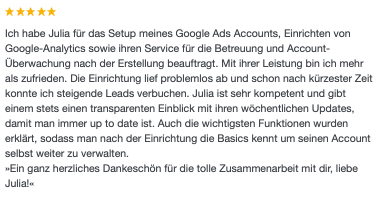 »Durch Julia haben wir einen guten Einblick in die Materie Google AdWords und Google Analytics für unser Business erhalten. Sie hat uns alle Themen näher erläutert, toll aufbereitet und uns das perfekte Handwerk an die Hand gegeben, um selbstständig daran weiterzuarbeiten. Ihr Support ist wirklich Goldwert.«