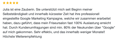»Julia unterstützt mich seit Beginn meiner Selbstständigkeit und innerhalb kürzester Zeit hat ihre professionell eingestellte Google Marketing Kampagne, welche wir zusammen erarbeitet haben, dazu geführt, dass mein Friseursalon fast 100% Auslastung erreicht hat. Durch Kundenumfragen sind min. 80% der Neukunden über "Google" auf mich gekommen. Sehr effektiv, und dass innerhalb weniger Monate!«